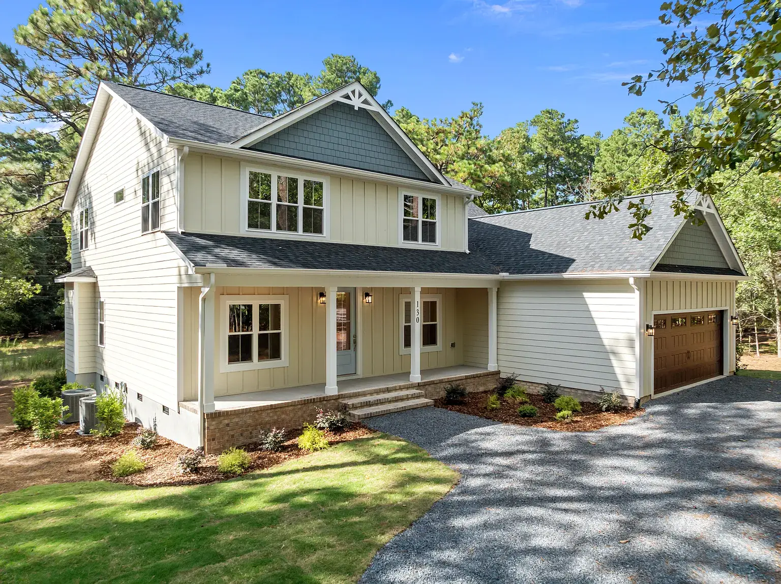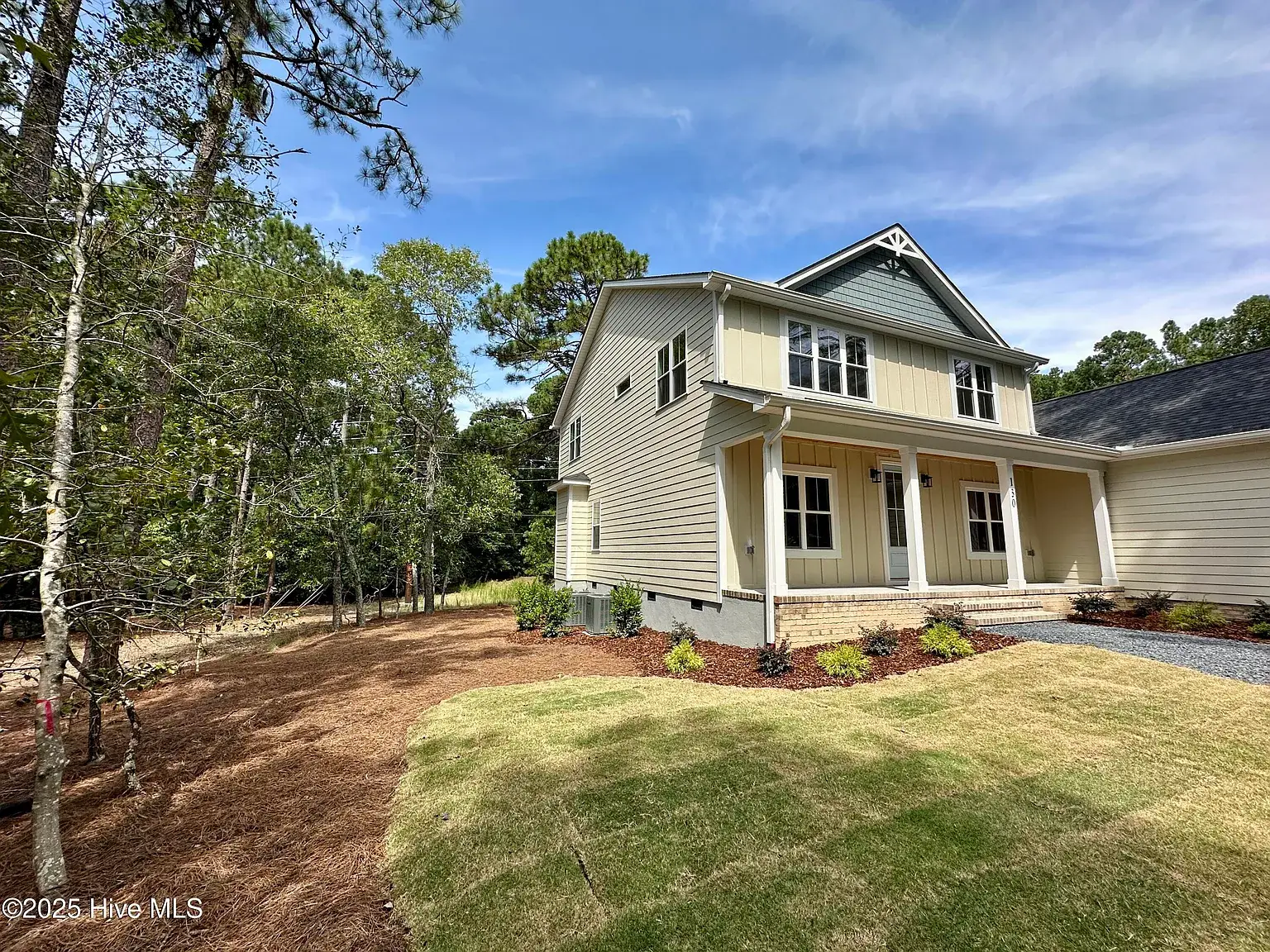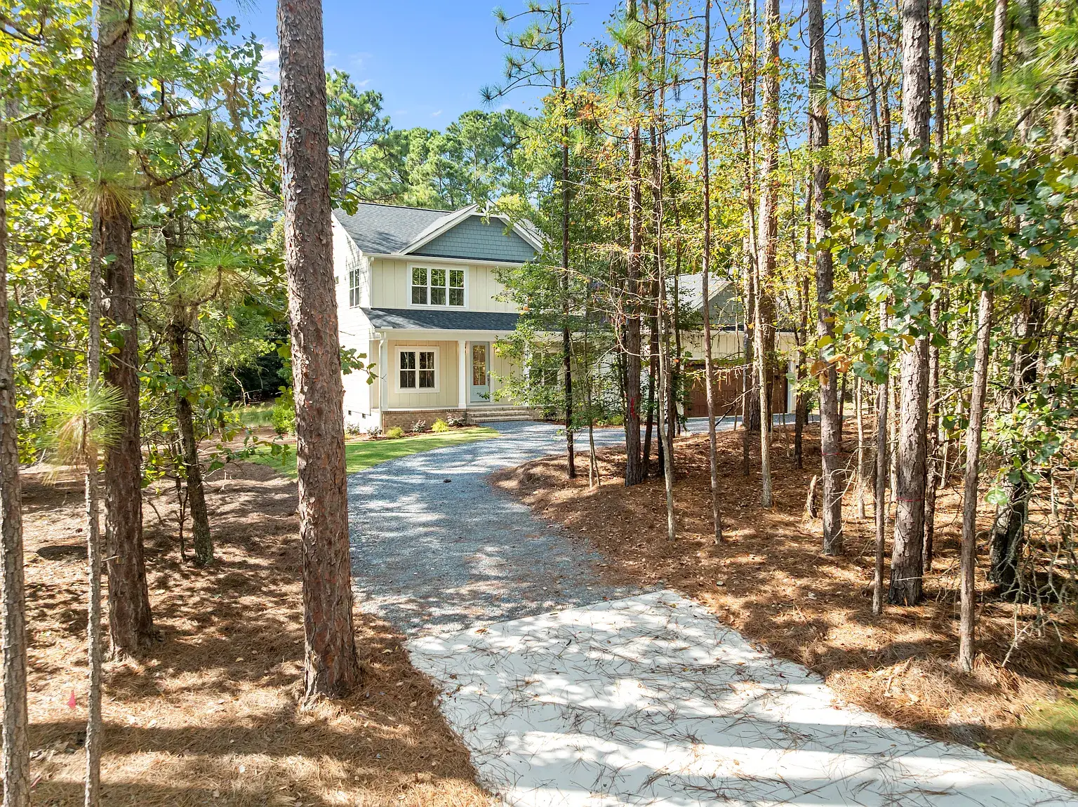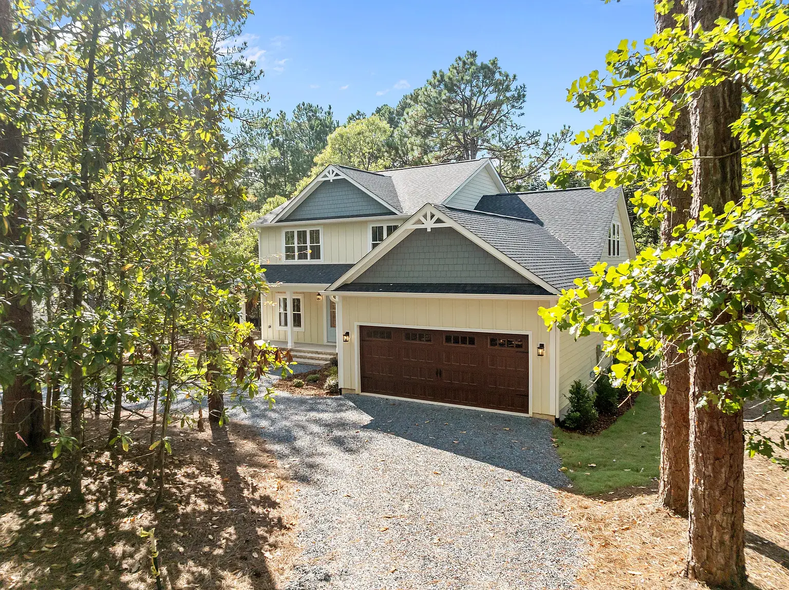 Beautiful new construction in The Village of Pinehurst. Welcome to this private setting in a conveniently located area. This gorgeous and inviting home is nearly complete, featuring thoughtful design and attractive upgrades. At almost 3500 square feet, there is room for everyone and space to enjoy hobbies and family time. Situated on a cul-de-sac, the exterior is clad in Hardy brand, cement fiber board siding for timeless quality and elegance. Covered front and rear porches set the exterior off in an inviting way. Extra-large garage with plenty of room for storage. The Crawl space is semi-encapsulated. The circular driveway is convenient, as well as functional and attractive. Inside, you’ll find high-quality laminate throughout the first floor, which also has a dedicated office, dining room, as well as laundry, powder room, and primary suite. The gourmet kitchen has GE Profile appliances, including a side-by-side French-door refrigerator, beautiful light fixtures, a custom fireplace mantle with gas logs, pantry cabinets with pullout shelves, and many other touches for the kitchen. Oak treads highlight the stairwell along with beautiful and functional sconce lighting. Upstairs, three additional bedrooms are situated around the loft area, a full bathroom, and extra extra-large bonus room with a fifth bedroom, potentially. Many extra storage closets throughout the home spacious and thoughtful layout in a private setting, all in the village of Pinehurst, and a short, five-minute drive to the Pinehurst hotel.