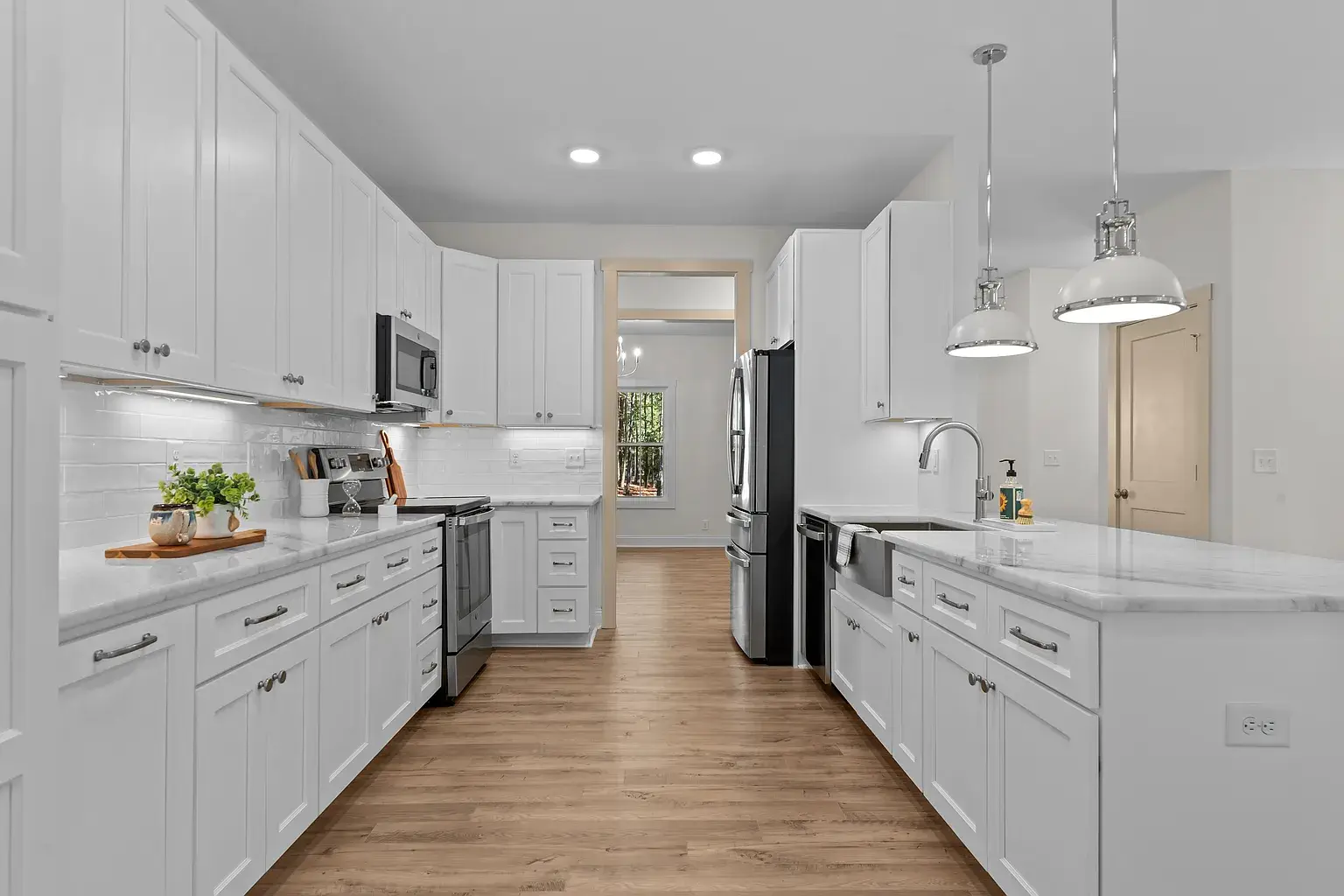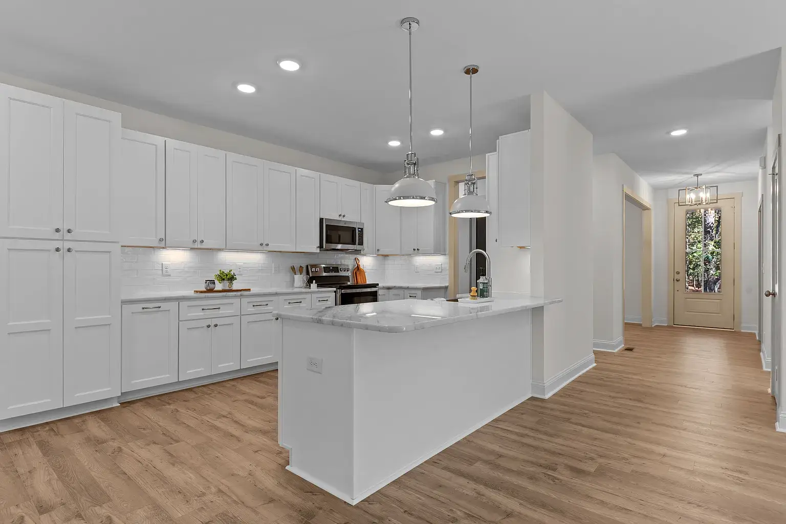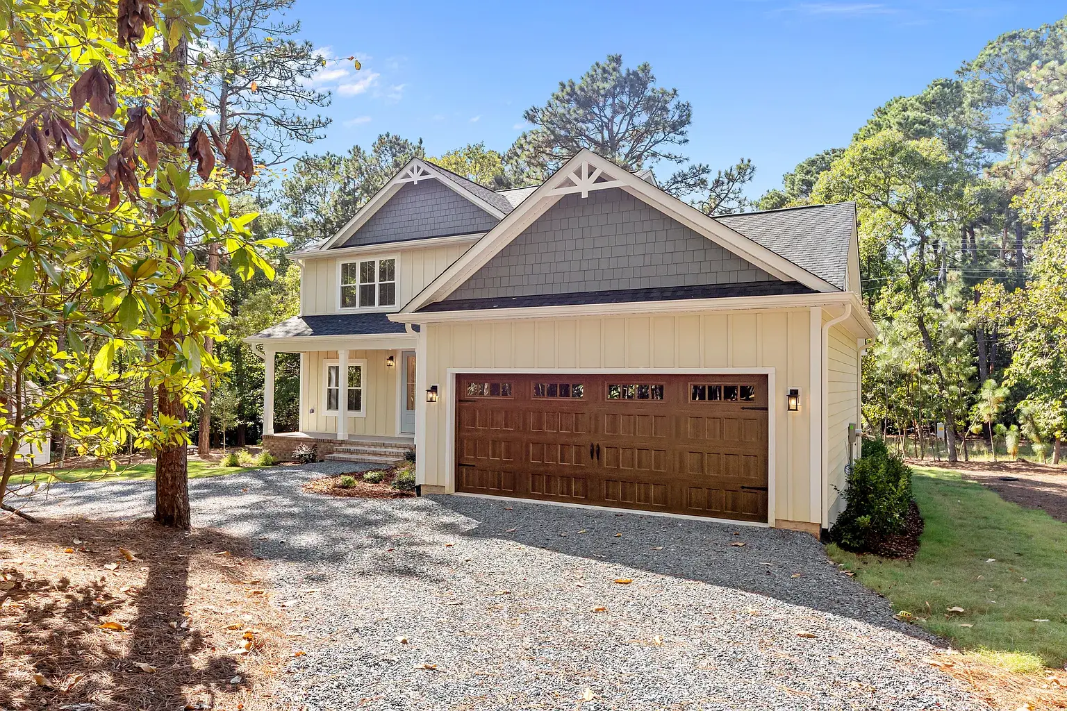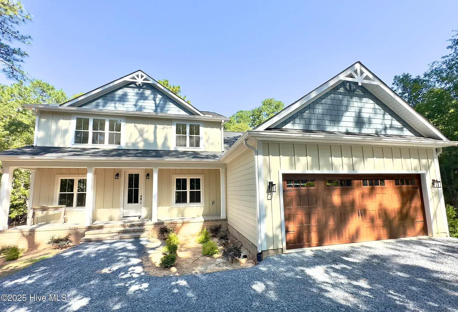 Beautiful new construction in The Village of Pinehurst. Welcome to this private setting in a conveniently located area. This gorgeous and inviting home is nearly complete, featuring thoughtful design and attractive upgrades. At almost 3500 square feet, there is room for everyone and space to enjoy hobbies and family time. Situated on a cul-de-sac, the exterior is clad in Hardy brand, cement fiber board siding for timeless quality and elegance. Covered front and rear porches set the exterior off in an inviting way. Extra-large garage with plenty of room for storage. The Crawl space is semi-encapsulated. The circular driveway is convenient, as well as functional and attractive. Inside, you’ll find high-quality laminate throughout the first floor, which also has a dedicated office, dining room, as well as laundry, powder room, and primary suite. The gourmet kitchen has GE Profile appliances, including a side-by-side French-door refrigerator, beautiful light fixtures, a custom fireplace mantle with gas logs, pantry cabinets with pullout shelves, and many other touches for the kitchen. Oak treads highlight the stairwell along with beautiful and functional sconce lighting. Upstairs, three additional bedrooms are situated around the loft area, a full bathroom, and extra extra-large bonus room with a fifth bedroom, potentially. Many extra storage closets throughout the home spacious and thoughtful layout in a private setting, all in the village of Pinehurst, and a short, five-minute drive to the Pinehurst hotel.