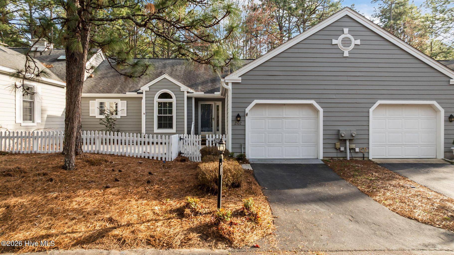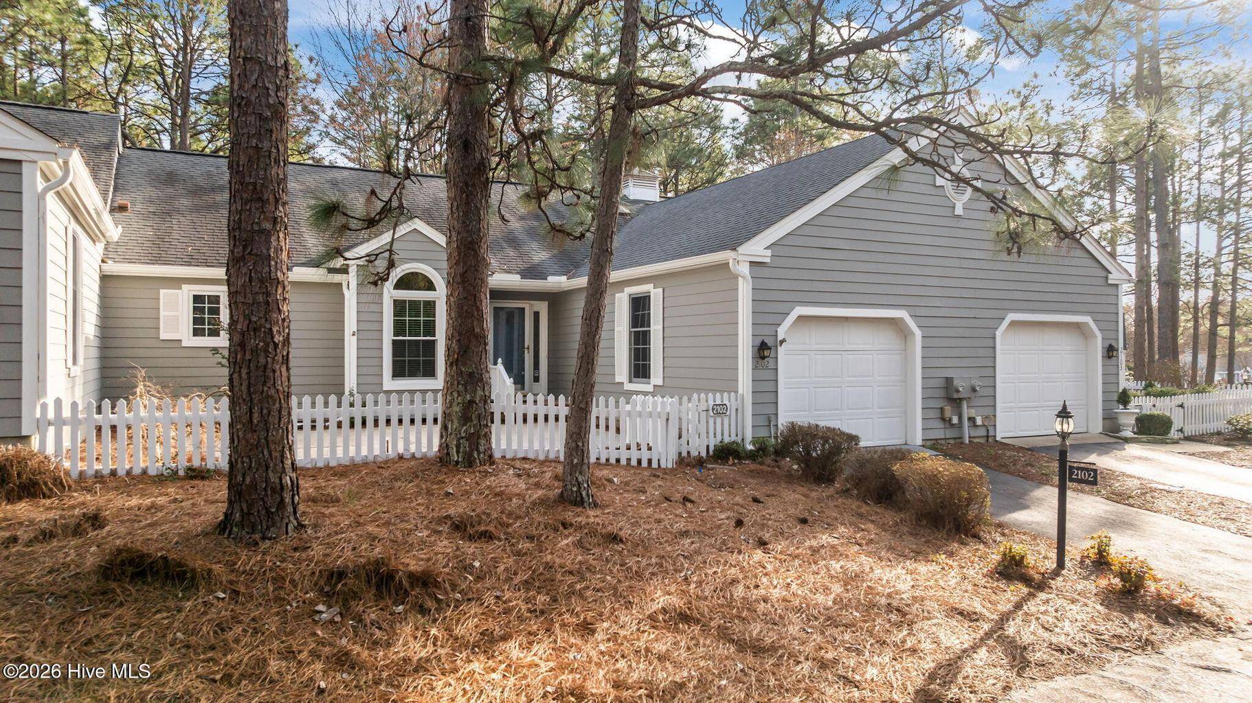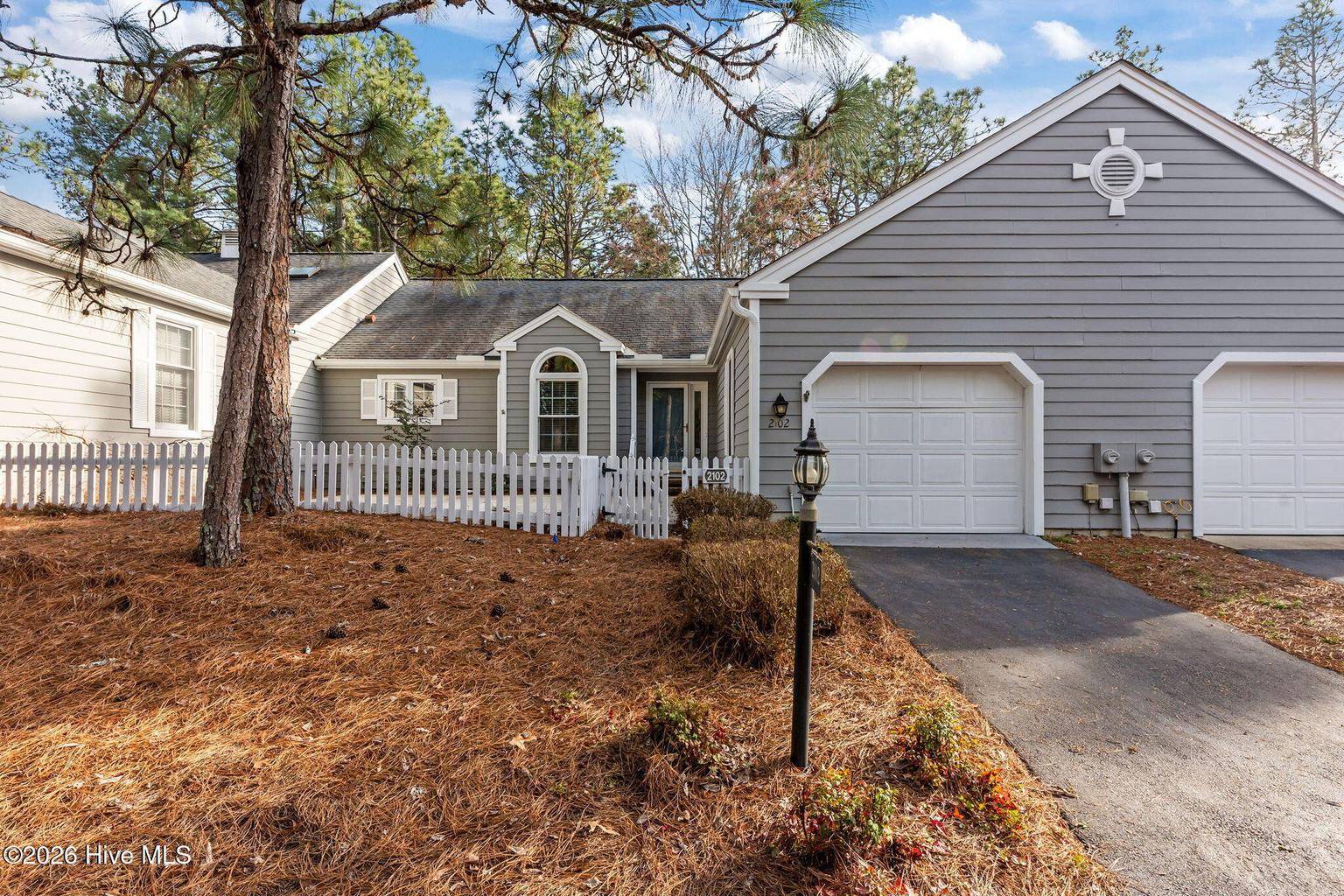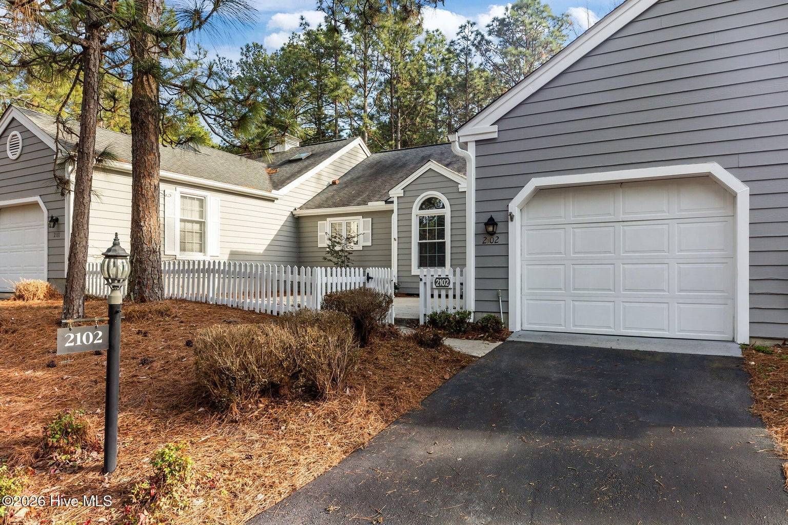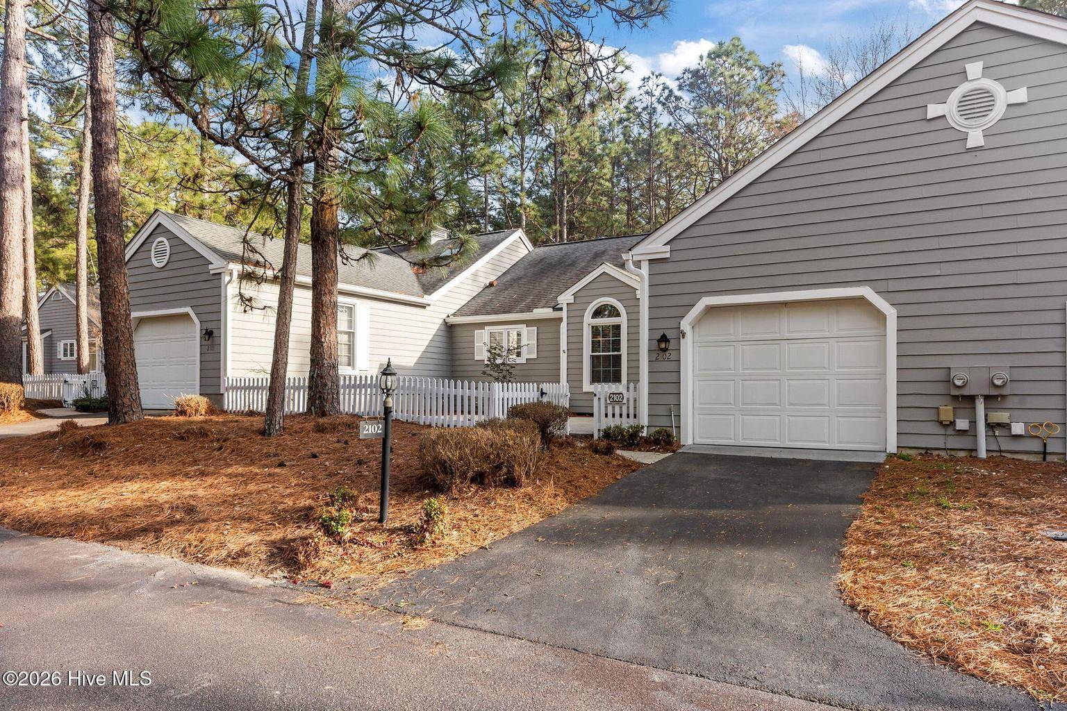 This is what you have been waiting for! Two-bedroom two-bathroom townhome in the peaceful Pinehurst neighborhood of Bretton Woods, complete with LVP flooring, smooth ceilings, and an attached transferable Pinehurst Country Club membership for those who want to take advantage of it! Not to mention the 1-car attached garage, fresh paint, and custom blinds throughout. Enjoy tranquil views from the covered rear porch and sunny days from the large front courtyard. Ceilings in the great room and primary bedroom are vaulted, leading to a spacious feeling. The primary suite boasts ample closet space as well as a separate vanity area from the bathroom itself, equipped with its own sink. Perfect split floor plan, with the great room boasting a wet bar dividing the guest area from the primary. Gorgeous cabinetry and newer appliances in the kitchen, along with under cabinet lighting. Located in the Lake Pinehurst area, this is an ideal spot for walks. Just a 5-minute ride from the quaint Village of Pinehurst, offering community events, dining, shopping, and so much more. 5 minutes from Pinehurst Country Club. Come enjoy carefree, friendly living at 2102 Stickney Circle!