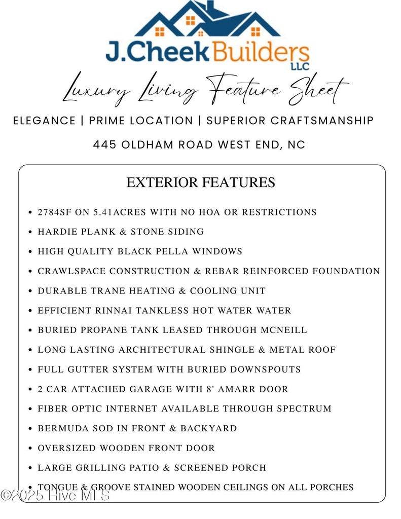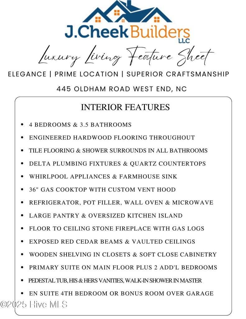 NEW CONSTRUCTION by J Cheek Builders, Moore County’s premier builder, COMPLETED! Ready to move in!! This gorgeous 4 bedroom home sits on over 5 ACRES, with all the PRIVACY one could desire! Close to your day-to-day needs, just outside Pinehurst, yet providing the SECLUSION one craves after a long day. FIBER OPTIC INTERNET AVAILABLE through Spectrum! The SCREENED PORCH lends itself to quiet evenings. Inside, enjoy a CHEFS KITCHEN, complete with a BUILT-IN GAS COOKTOP, custom vent hood, POT FILLER, soft close cabinetry, OVERSIZED ISLAND, wall oven…. and a PANTRY that can hold ‘everything but the kitchen sink’. Not only is the PRIMARY SUITE ON THE MAIN LEVEL, but so are two additional bedrooms for convenient living. Added ‘bonus’ of a full ensuite bedroom over the garage – and you have the PERFECT LAYOUT. Luxurious finishes from the ground up – high quality Hardie plank siding, stone accents, Pella windows, rebar enforced foundation, TRANE heating and cooling unit, TANKLESS HOT WATER HEATER, buried propane tank, architectural shingles …the list goes on. Inside – engineered HARDWOOD flooring , along with carefully selected tile in the bathrooms. All cabinetry is SOFT CLOSE and of a quality that is hard to match. WOODEN SHELVING in all closets and pantry, and a EXPOSED WOODEN BEAMS in the GREAT ROOM. Zoned for West Pine Elementary, West Pine Middle and Pinecrest High. Minutes from First Health Moore Regional Hospital and the surrounding medical park. Close to the parks in Pinehurst. Outside city limits, zoned RA-5 allowing for freedom in regulation as well as low county taxes. Public water. NO HOA! NO Restrictive Covenants. The backyard is ready for A POOL!! Come see this very special new build today before it is gone!!